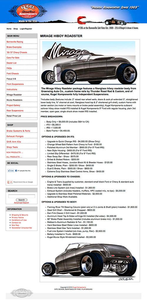 Kugel Komponents has been a client of mine for over a decade now. Over the years I have designed their print materials for advertising for most major hot rod magainzes, flyers, catalogs, and sales sheets. In the last several years we have focused on internet based media and ecommerce. I designed their shopping cart system using an open source platform and integrated it into the existing website for other features. I have provided video training to the staff for order processing and general cart maintainance using screen capture software. Additionally, I provide general IT support for email and web hosting and act as the technical representative for web hosting services. Here are a few examples of the website. For a more comprehensive look, visit their site at www.kugelkomponents.com.
